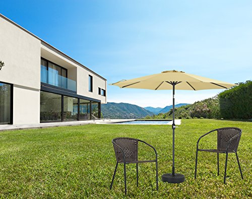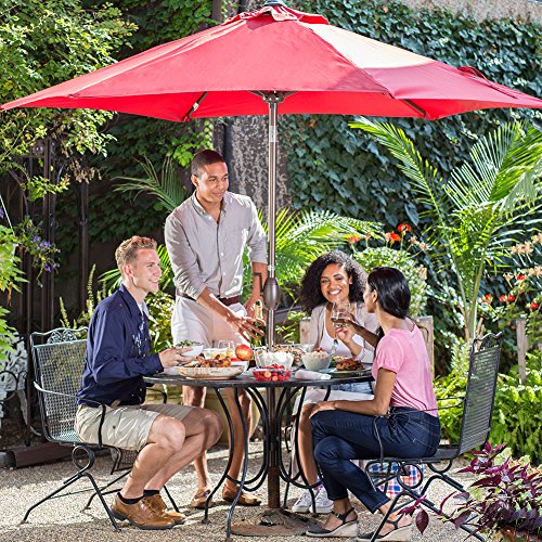 A wind vent prevents the unit from collapsing during wind gusts and steel arms provide additional support to keep it from buckling. You can purchase a matching base to let it stand on its own or put it through the center ring of a patio table. However, the cranking arm does not move as quickly as other market umbrellas at the same price point.