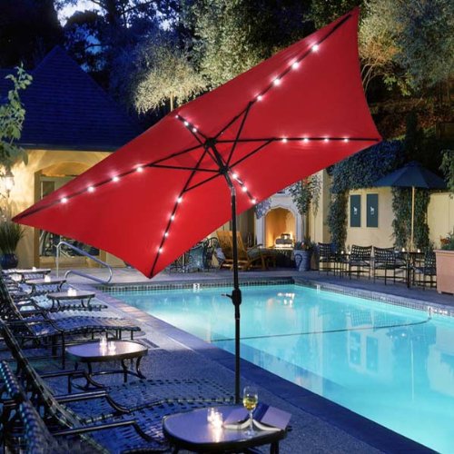 This rectangular shade is one of the most stylish units on the market. It is paired with a diamond-shape solar-powered panel on the canopy’s roof. The solar-powered lights last between 9 to 12 hours, providing the perfect ambiance for a romantic dinner on the patio or nighttime party by the pool. During the day, you can tilt the umbrella in the direction of the sun to keep the rays off your face.