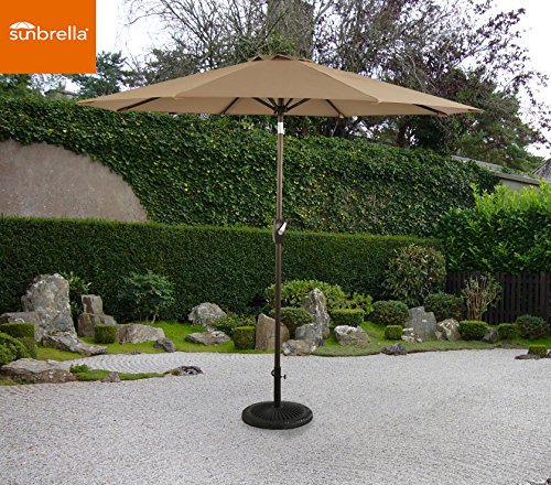 The umbrella fits most standard bases and requires at least 50 pounds of weight to keep it from flipping with a gust of wind. Unfortunately, the Sunbrealla fabric is only available in heather beige.
